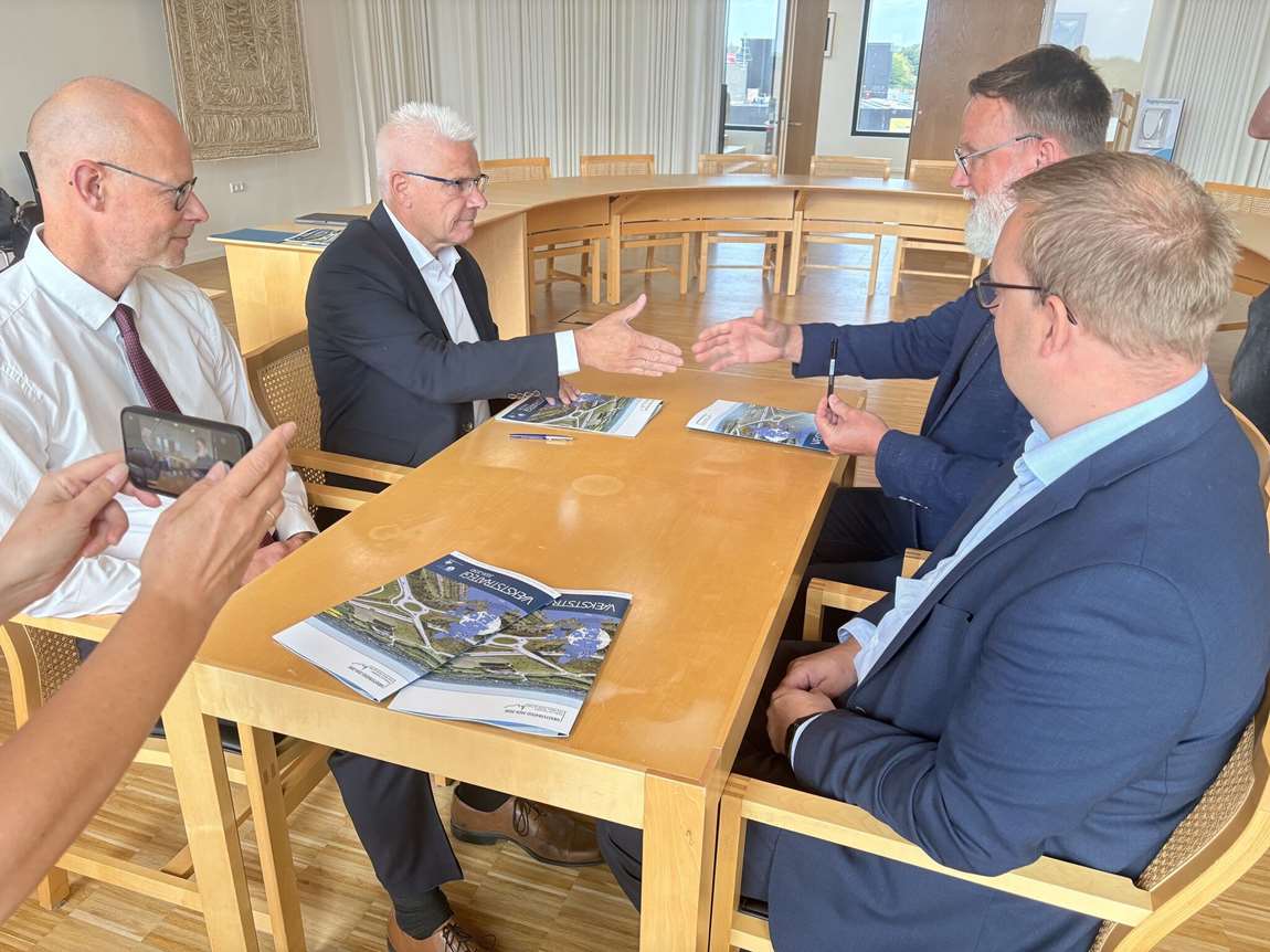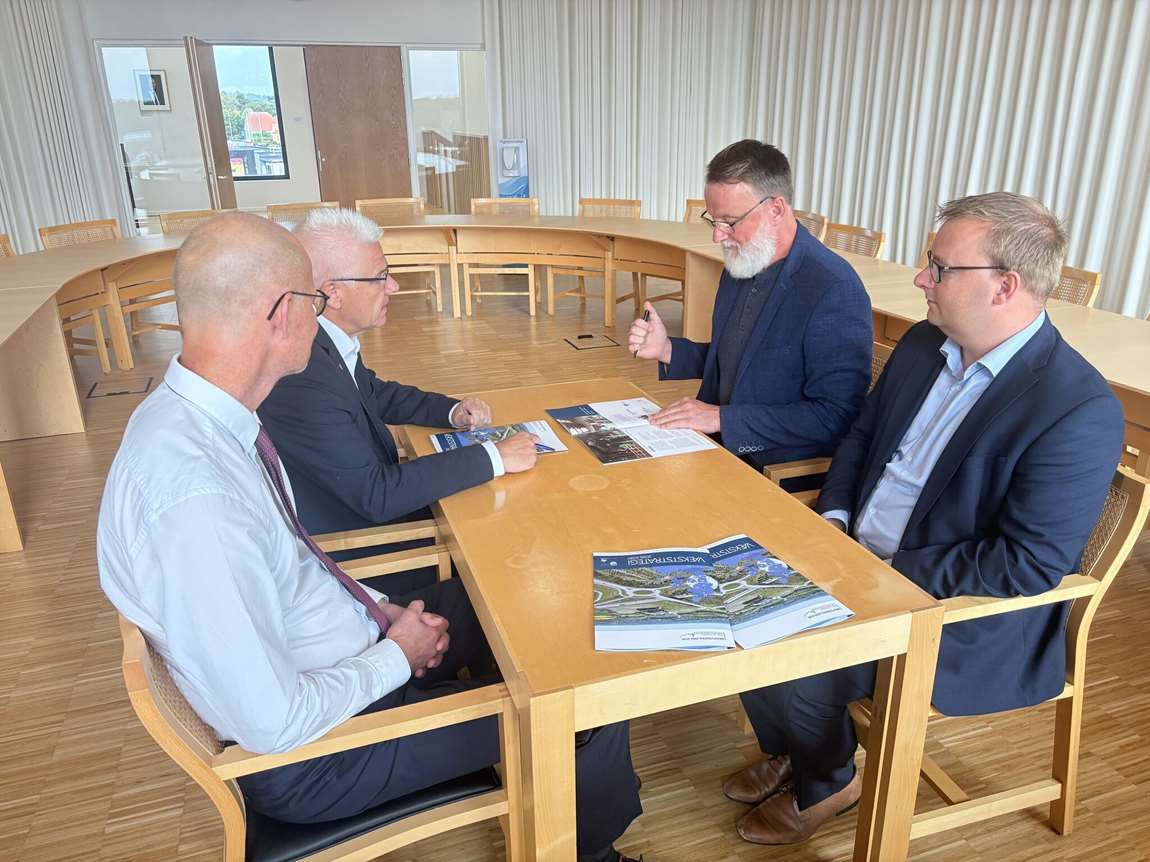 Daværende borgmester i Vejen Kommune, Frank Schmidt-Hansen og bestyrelsesformand for UdviklingVejen Ole Stubbe satte underskrifterne på Vækststrategien 2026-2030, flankeret af kommunaldirektør Thomas Reintoft og erhvervsdirektørMartin Dunlap Svane.